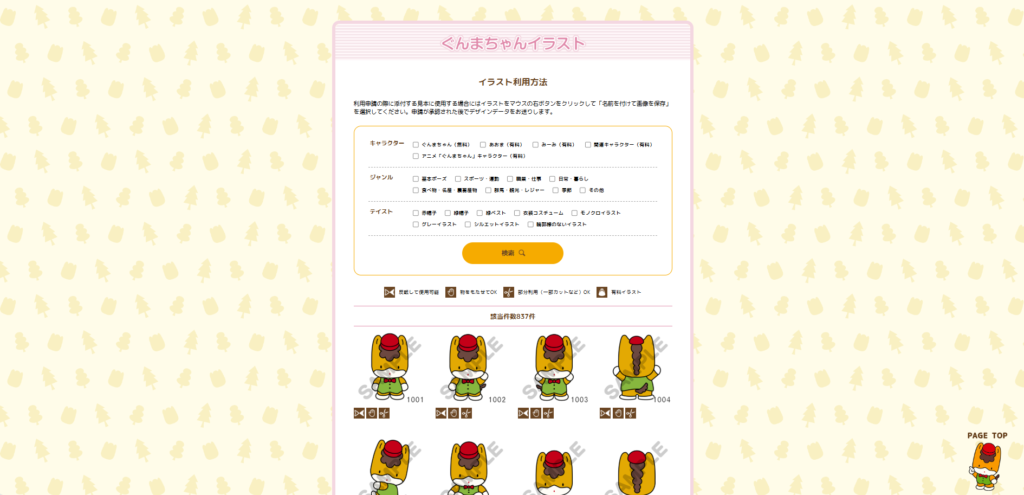 (1.イラストを探す>ぐんまちゃんイラスト一覧はこちら から、お気に入りのぐんまちゃん等のイラストを検索できます。)